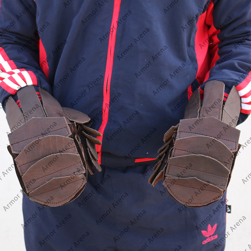 Medieval leather gauntlets were a type of armed leather glove which protected the hands and wrists of knights and soldiers in the medieval era. Medieval gauntlets evolved from simple leather gloves into sophisticated pieces of armor that combined leather. Early gauntlets were simple leather gloves worn for basic hand protection. In the 13th century, buckskin gauntlets were popular in France and Italy. In the 14th century, chainmail gauntlets were worn by medieval soldiers and knights. In the 15th century, the cuff of the gauntlet narrowed to protect against sword thrusts. The wrist and finger protection changed from one piece to multiple interlocking plates. This change allowed for greater wrist and finger motion. Leather gauntlets also appeared in the American West as military uniform accessories.The Leather Fighting Gauntlet is crafted from high quality upper leather which offering exceptional durability, flexibility and protection for combat, reenactments and training. Leather Fighting Gauntlet designed for both style and functionality which provides a secure fit while allowing dexterity for gripping weapons or shields. Viking leather gauntlets are available in 2 colors black and brown and this gauntlet complements a variety of medieval and fantasy armor sets. Warriors gauntlet available in sizes ranging from S/M, L/XL, to 2XL/3XL which ensures a comfortable and secure fit for warriors of all hand sizes. Medieval style leather gauntlets is a must have for any medieval enthusiast and perfect for historical reenactments, LARP, cosplay or collectors.