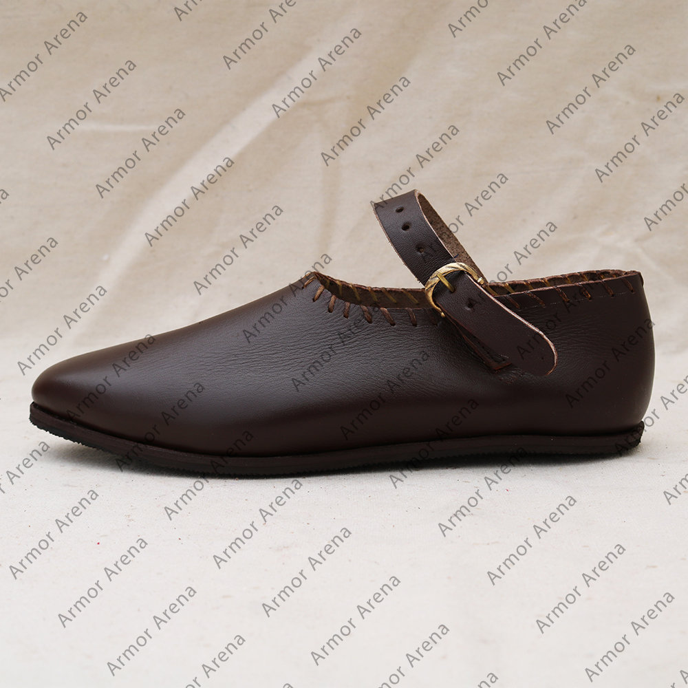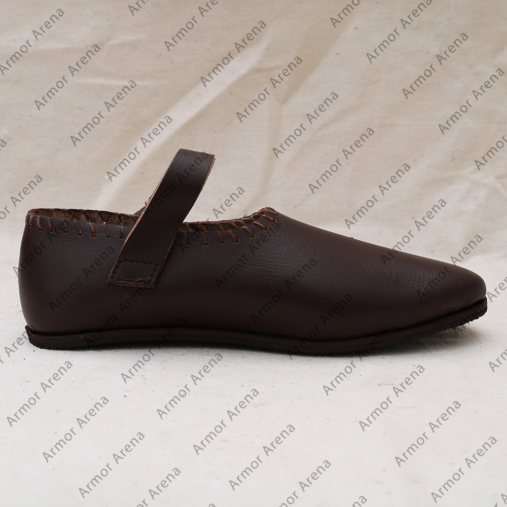 Medieval women's shoes with strap were made from quality leather and often fastened with buckles. The shoes with strap were often decorated with openwork patterns and cut-outs. The female shoes with strap are made carefully with focus on detail and craftsmanship to ensure they are both durable and historically accurate. Women shoes with straps are a great choice for reenactments, LARP events or medieval battles. These ladies shoes with strap are crafted from high quality cowhide leather which provide an authentic look and comfort while wearing in the events or in battlefields. We have 3 Types of sole so you can choose from three sole types to fit your needs: the classic leather sole for a traditional style other is leather sole with a rubber sheet for better grip on modern surfaces and the last one is leather sole with steel nails for extra strength and a rugged look. These options let you customize the shoes for different activities and terrains.