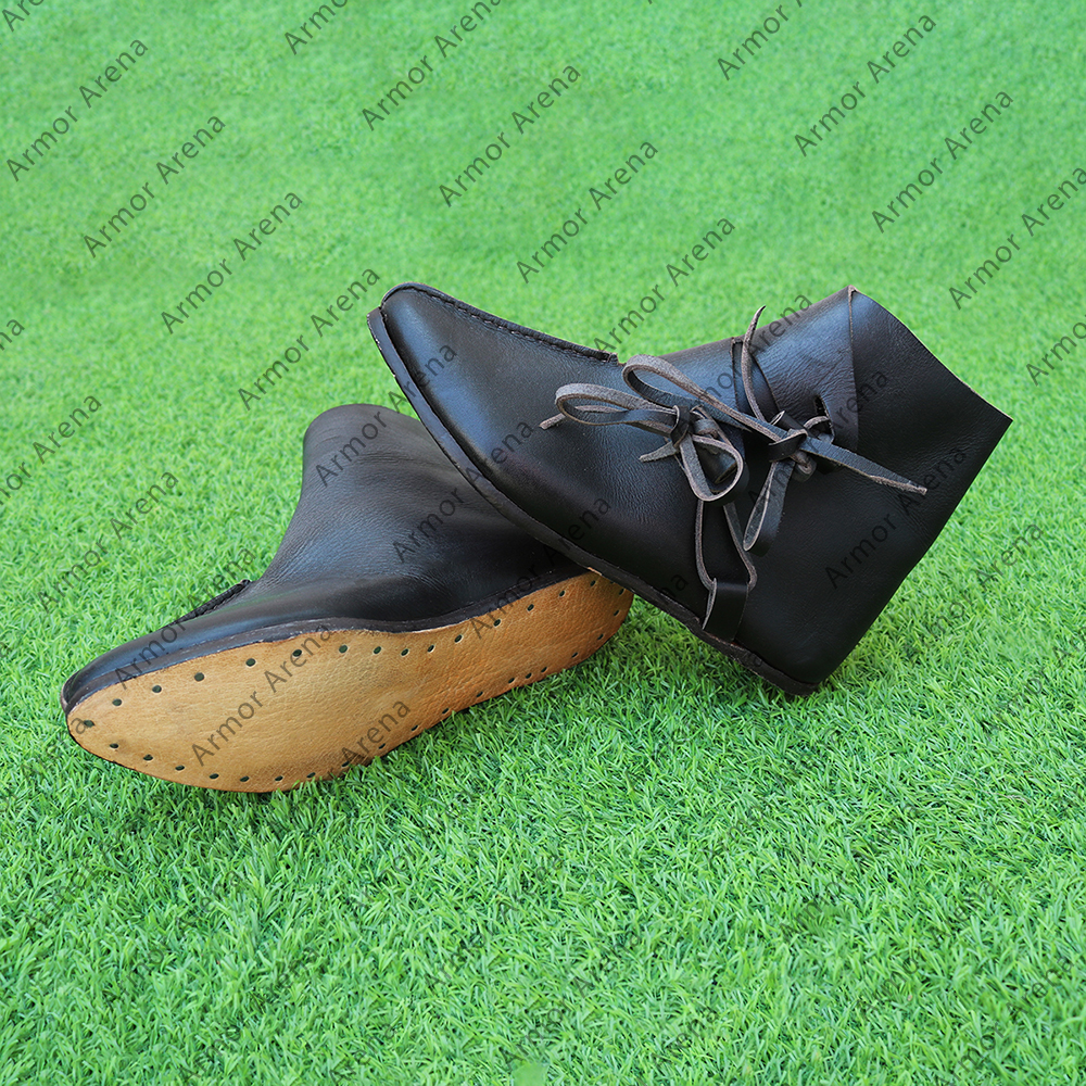 The medieval age shoes are made carefully with focus on detail and craftsmanship to ensure they are both durable and historically accurate. Leather string shoes are a great choice for reenactments, LARP events or cosplay. These medieval shoes are crafted from high quality cowhide leather which provide an authentic look and comfort while wearing in the events or in battlefields. We have 3 Types of sole so you can choose from three sole types to fit your needs: the classic leather sole for a traditional style other is leather sole with a rubber sheet for better grip on modern surfaces and the last one is leather sole with steel nails for extra strength and a rugged look. These options let you customize the shoes for different activities and terrains.