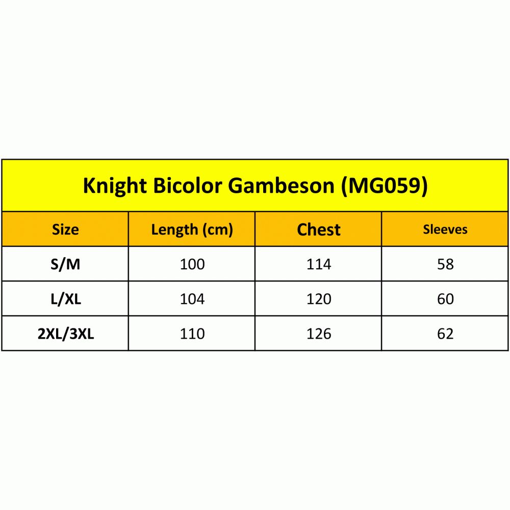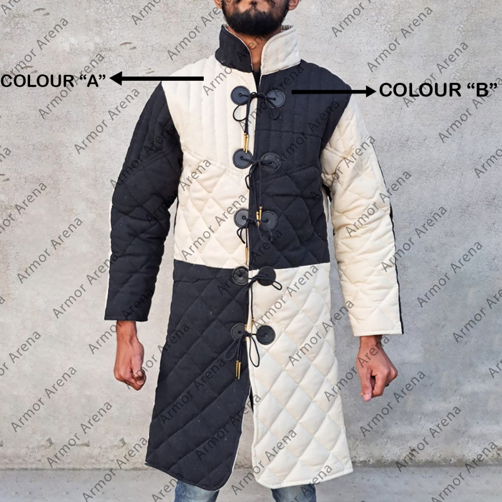 The Knight Bicolor Gambeson is a top-quality and practical piece of medieval armor which is suitable for reenactors, collectors and history enthusiasts. This bicolor medieval gambeson offers an excellent combination of safety and comfort. The bicolor knight gambeson offers historical accuracy while still providing flexibility and durability in battle. The Bicolor Gambeson Bicolor is crafted with the best cotton canvas fabric materials with polyester padding. It is an ideal undergarment for knights which provide padding on below their outer armor. This gambeson is designed to cushion the body from the harsh impacts of swords, axes and other medieval weapons. The gambeson provides initial protection during combat. The Knight 2-tone gambeson features a unique color combination adding a touch of style to your medieval ensemble. Its tailored fit and quilted construction ensure both comfort and ease of movement to making it a vital piece of any knight's gear.