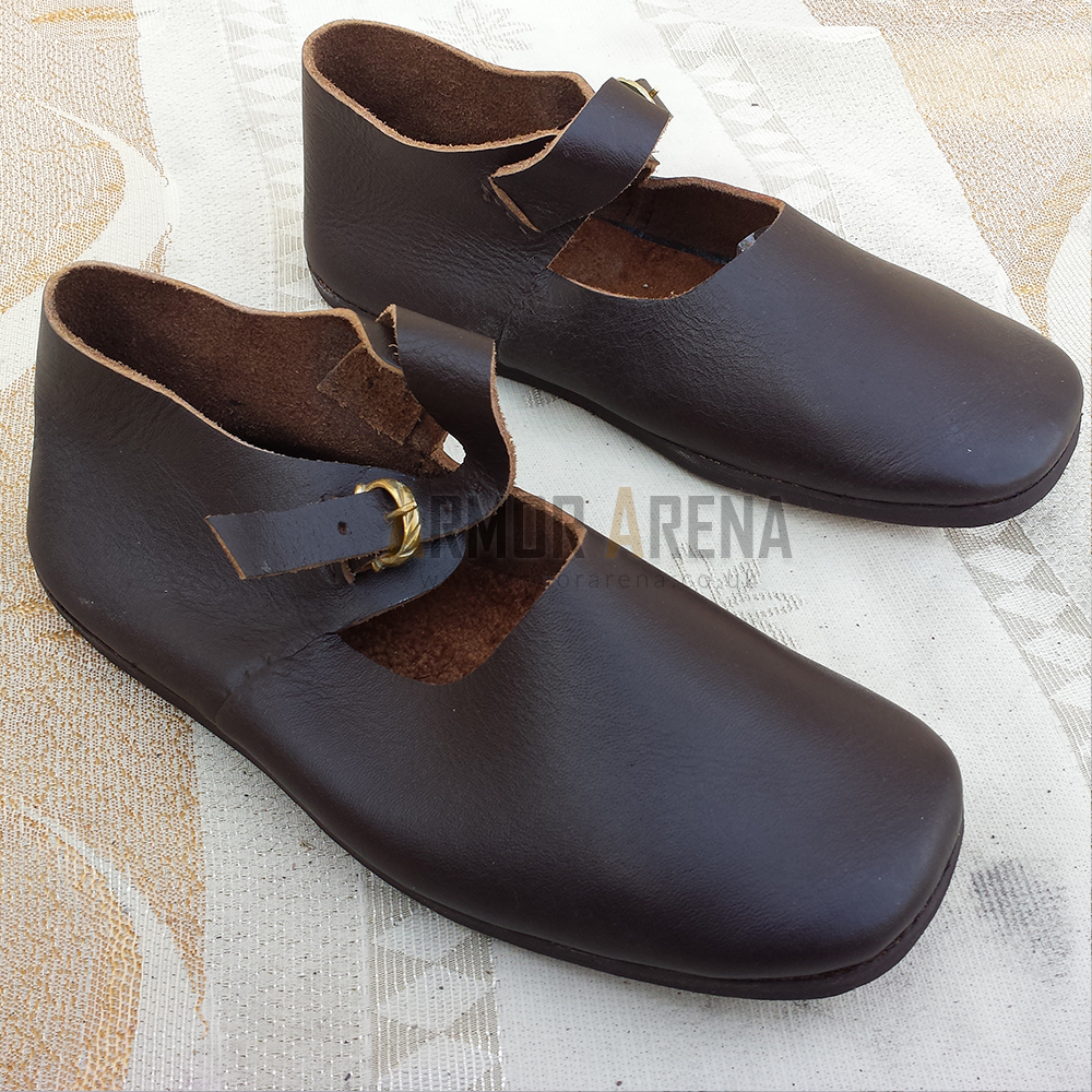 The latchet shoes are made carefully with focus on details and craftsmanship to ensure they are both durable and historically accurate. Medieval shoes are a great choice for reenactments, LARP events or cosplay. These latchet shoe with strap are crafted from high quality leather which provide an authentic look and comfort while wearing in the events or in battlefields. The strap and buckle add the better look to the shoe and make more easier to wear. We have 3 Types of sole so you can choose from three sole types to fit your needs: the classic leather sole for a traditional style other is leather sole with a rubber sheet for better grip on modern surfaces and the last one is leather sole with steel nails for extra strength and a rugged look. These options let you customize the shoes for different activities and terrains.