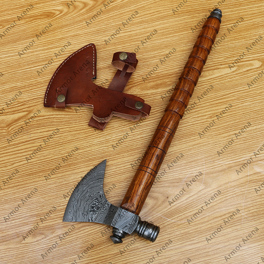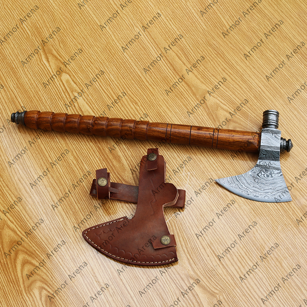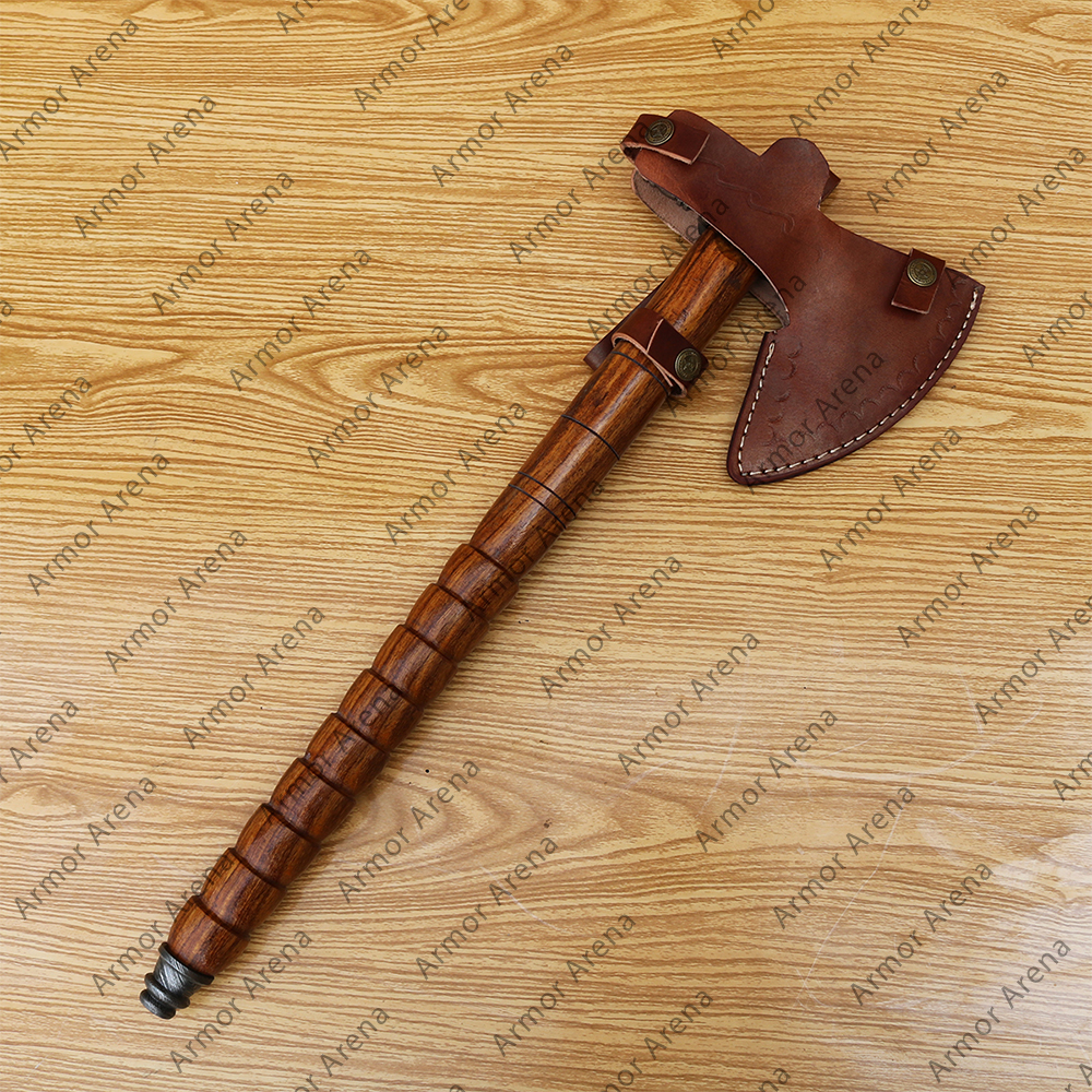 We have many Hand Forged custom made Axe with leather scabbard and wooden handle. Steel head is oiled to avoid rush. Our all axes and knives are practical. The wood combined with strength, feel and textured. The wood is selected carefully not for its texture, but also for the location of the wood so that the axe handle is not only harmoniously looked but also strong enough. Our axes are sharp and battle ready. The axe is suitable for cutting wood, hatchet firewood, etc. Things don’t end here as axes have sturdiness, shiny appearance, personalized look & feel, sharpness, along with speedy delivery. Everything hit the mark.