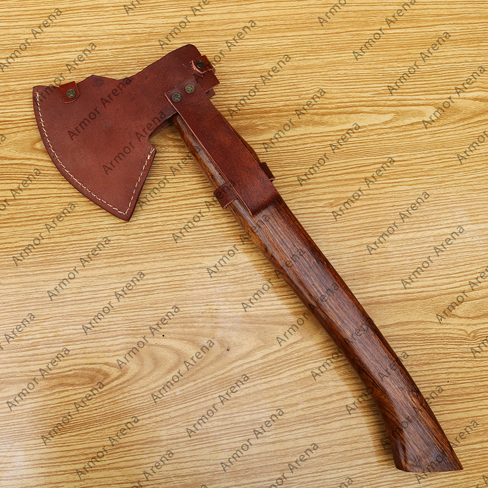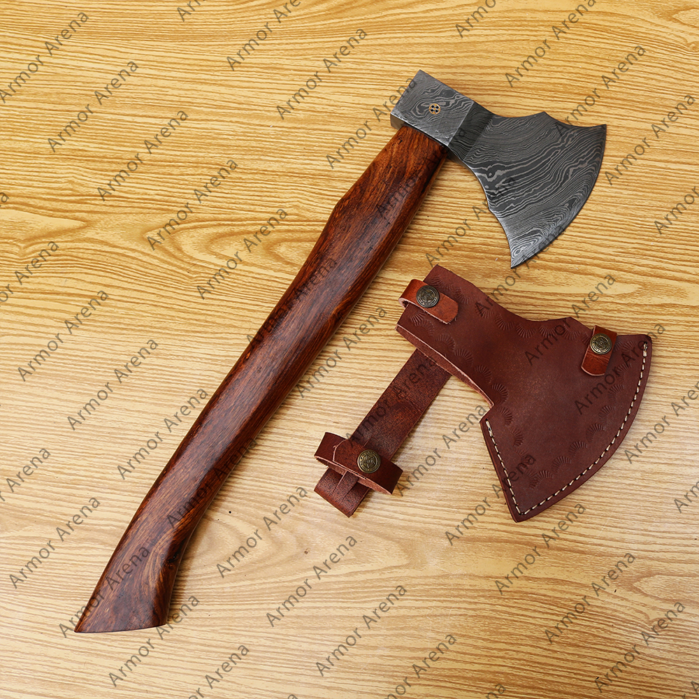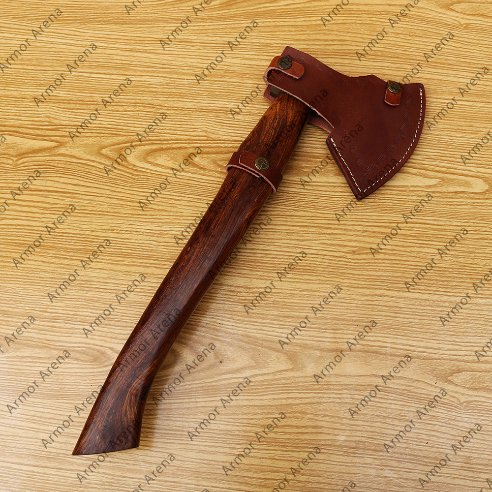 We have many Hand Forged custom made Axe with leather scabbard and wooden handle. Steel head is oiled to avoid rush. Our all axes and knives are practical. The wood combined with strength, feel and textured. The wood is selected carefully not for its texture, but also for the location of the wood so that the axe handle is not only harmoniously looked but also strong enough. Our axes are sharp and battle ready. The axe is suitable for cutting wood, hatchet firewood, etc. Things don’t end here as axes have sturdiness, shiny appearance, personalized look & feel, sharpness, along with speedy delivery. Everything hit the mark.