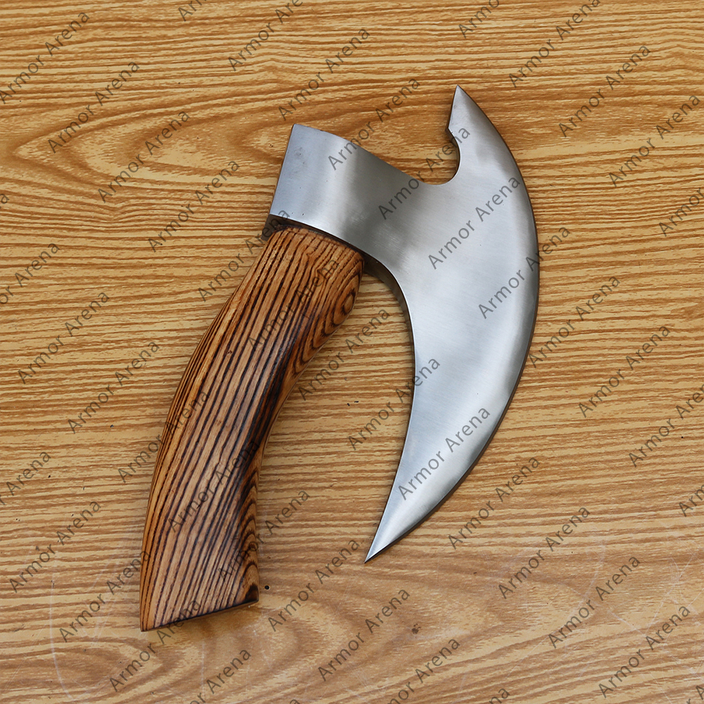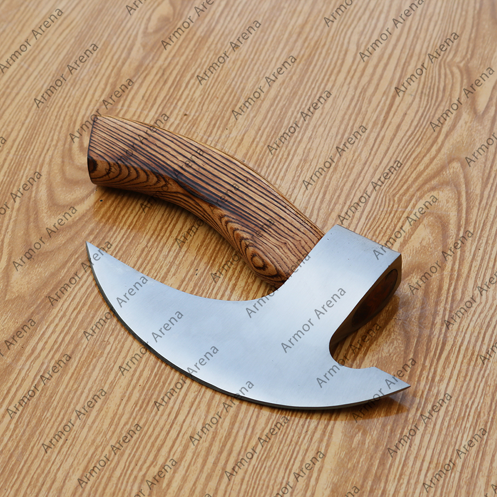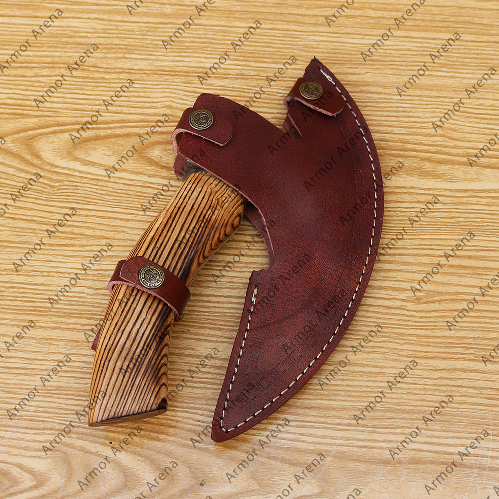 We have many Hand Forged custom made Axe with leather scabbard and wooden handle. Steel head is oiled to avoid rush. Our all axes and knives are practical. The wood combined with strength, feel and textured. The wood is selected carefully not for its texture, but also for the location of the wood so that the axe handle is not only harmoniously looked but also strong enough. Our axes are sharp and battle ready. The axe is suitable for cutting wood, hatchet firewood, etc. Things don’t end here as axes have sturdiness, shiny appearance, personalized look & feel, sharpness, along with speedy delivery. Everything hit the mark.