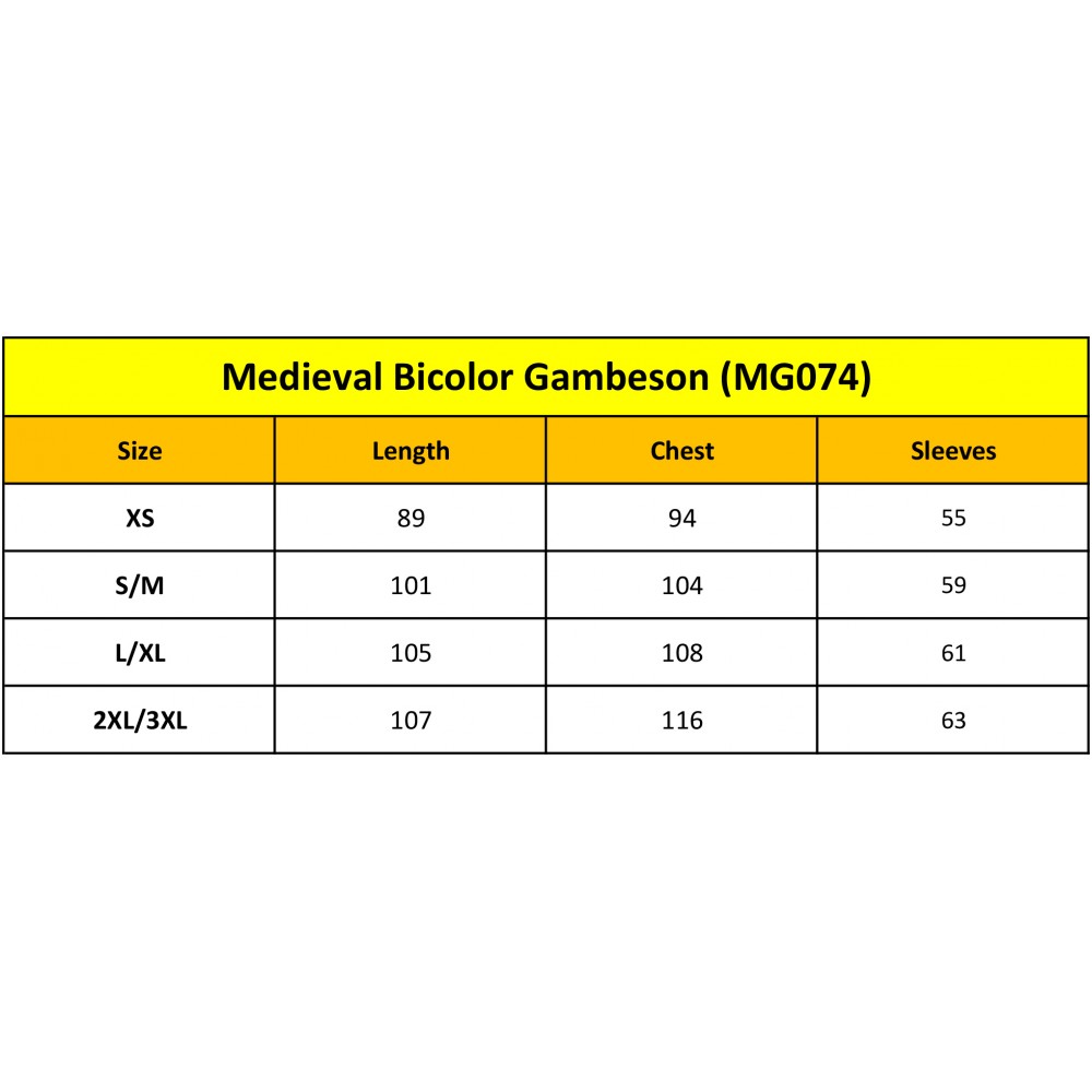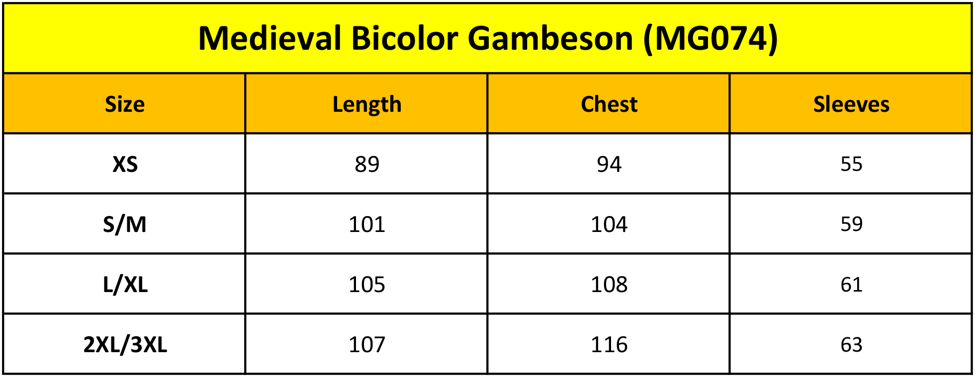 This bicolor Gambeson offers a great fit for everyone and it is available in all sizes from XS to XXL. This two tone Gambeson comes in different cotton canvas colors such as Black, Brown, Natural, Blue, Olive, Wine Red, Light grey and Yellow. Select any 2 different color according to your requirement such as Color A or Color B.  The inner lining color changing depending on availability and making each gambeson unique in its style. All gambeson are crafted carefully that maintain the authenticity of historical time and there may be slight differences in every gambesons which adding to its special charm. Perfect for historical reenactments, LARP events or adding to your collection then this medieval gambeson is a reliable and authentic choice for any medieval fan.