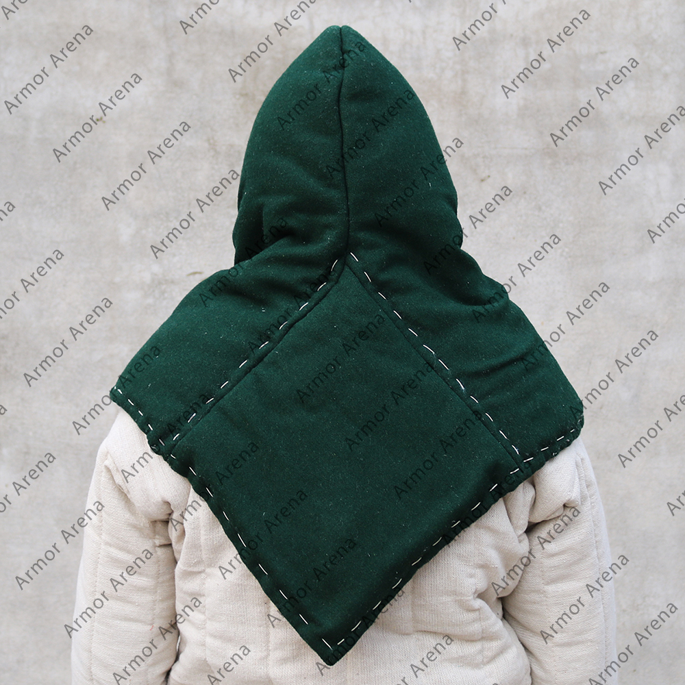 Design of Skjoldehamn Padded Combat Hood is inspired by an archaeological find from the 10th to 12th century. In 1936, a fully clothed bog body was discovered on a farm in Skjoldehamn, Norway. The hood found with it is notable for its pointed hem and a square piece inset on the chest. The outfit includes two tunics, pant, a braided belt, and a hood, which resemble the colorful and warm clothing of the Samí people, especially the braids and necklines of the tunics and the braid at the ankle of the pants. While many sources confirm trade between the Norse and Samí, chaperones are often seen in Norse models. The Skjoldehamn chaperones are a great choice for Norwegian re-enactors.